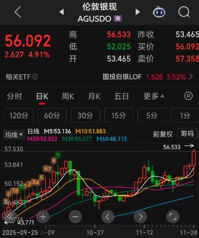 11月28日晚,伦敦银突破历史新高56美元,夜盘沪银也突破13000元。
